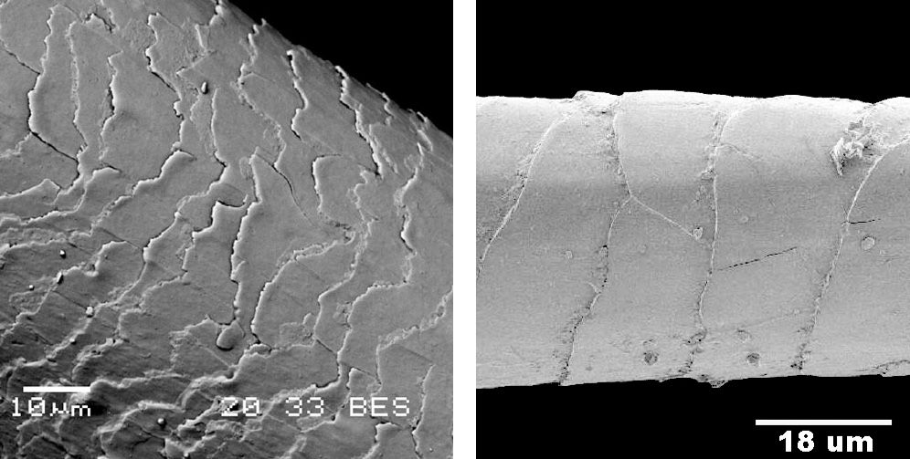 The hair on your head is perfectly designed, not too thick and not too thin. Tiny, dead overlapping scales make up our cuticles. These scales form a microscopic pattern unique to humans called the imbricate pattern, and it looks like a brick wall! Looking at the cuticle under the microscope is a quick way for a forensic scientist to know whether the hair evidence is from a human or an animal.